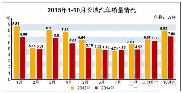 1-10月,长城汽车累计销666,947辆,同比增长15%。哈弗品牌销513,226辆,同比增长61%,轿车销售41,222辆,皮卡销售79,516辆。